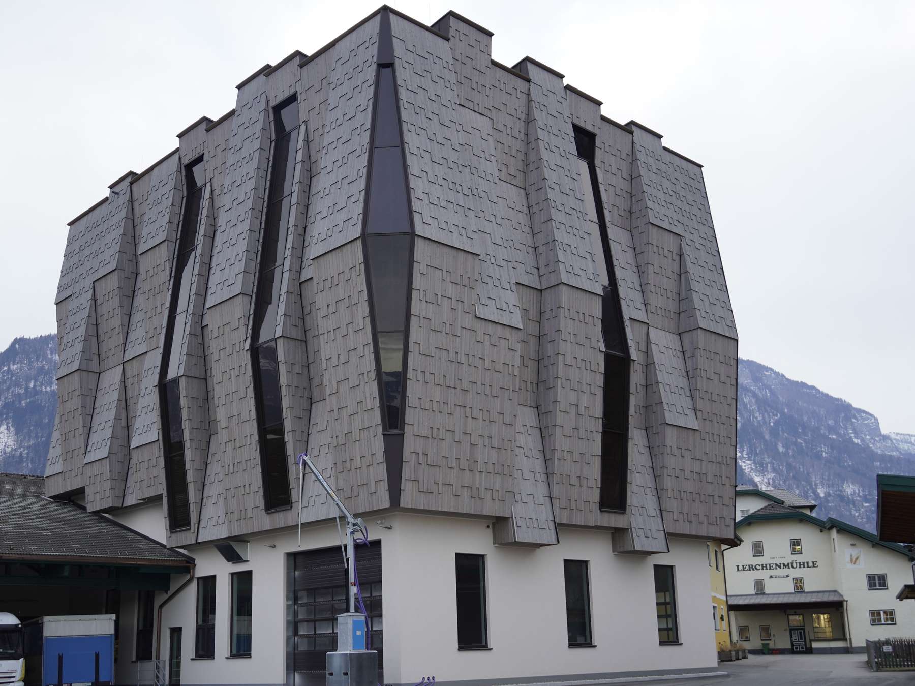 Eine regionale Mühle ist in Zeiten wirtschaftlicher Unsicherheit eine wichtige Ressource. Die Lerchenmühle im Bluntautal am Torrener Bach wurde 1495 erstmals urkundlich erwähnt. Mit dem innovativen Neubau des Silogebäudes ist die traditionsreiche Mühle nun im 21. Jahrhundert angekommen. Die aus Lärchenschindeln geknickte Holzfassade des Siloturms symbolisiert die Getreideähre. Zwei moderne, betriebseigene Labore dienen zur lückenlosen Kontrolle der Rohware und Endprodukte.