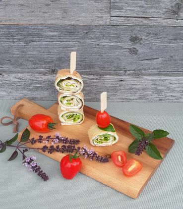 Milch, Eier, Salz und Mehl zu einem glatten Teig verrühren und in einer Pfanne Palatschinken ausbacken. Für die Wraps mache ich den Teig kompakter und backe die Palatschinken etwas dicker aus. Die ausgekühlten Palatschinken großzügig mit Frischkäse bestreichen und mit Salatblättern belegen. Einrollen, in Stücke schneiden und aufspießen oder einfach halbieren.