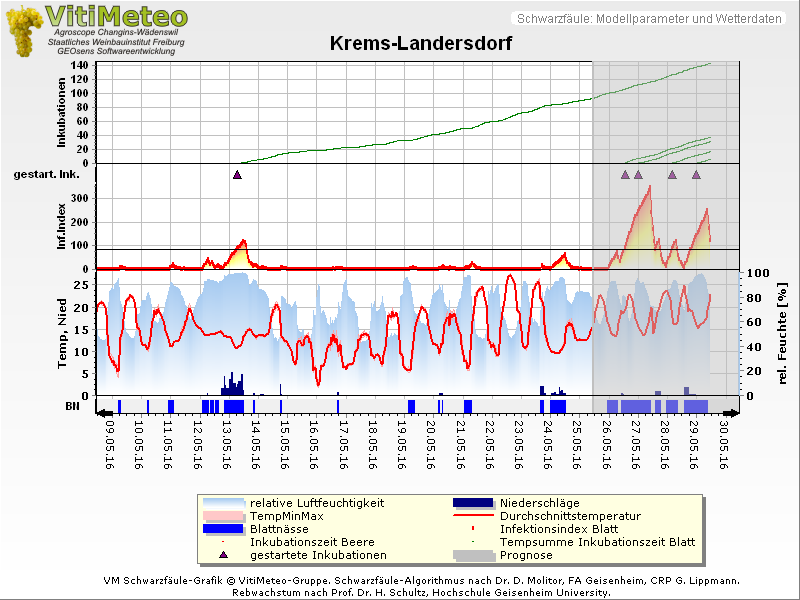 Beachten Sie die Hinweise des Rebschutzdienstes und die Schwarzfäule- Prognose auf der Plattform VitiMeteo.