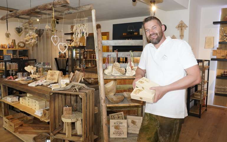 Es gibt viel zu sehen und zu kosten im „Schaukastl“ von Josef Stockklauser. Genau vor drei Jahren hat der Tischler seinen Geschenke- und Genussladen im Herzen von Lofer aufgesperrt. Er ist darauf spezialisiert, individuelle Wünsche für Hochzeiten, Taufen, Geburtstage etc. umzusetzen. Er fertigt aber nicht nur aufwändige Holzkunst an, sondern hat auch selbstgemachte Delikatessen im Angebot.