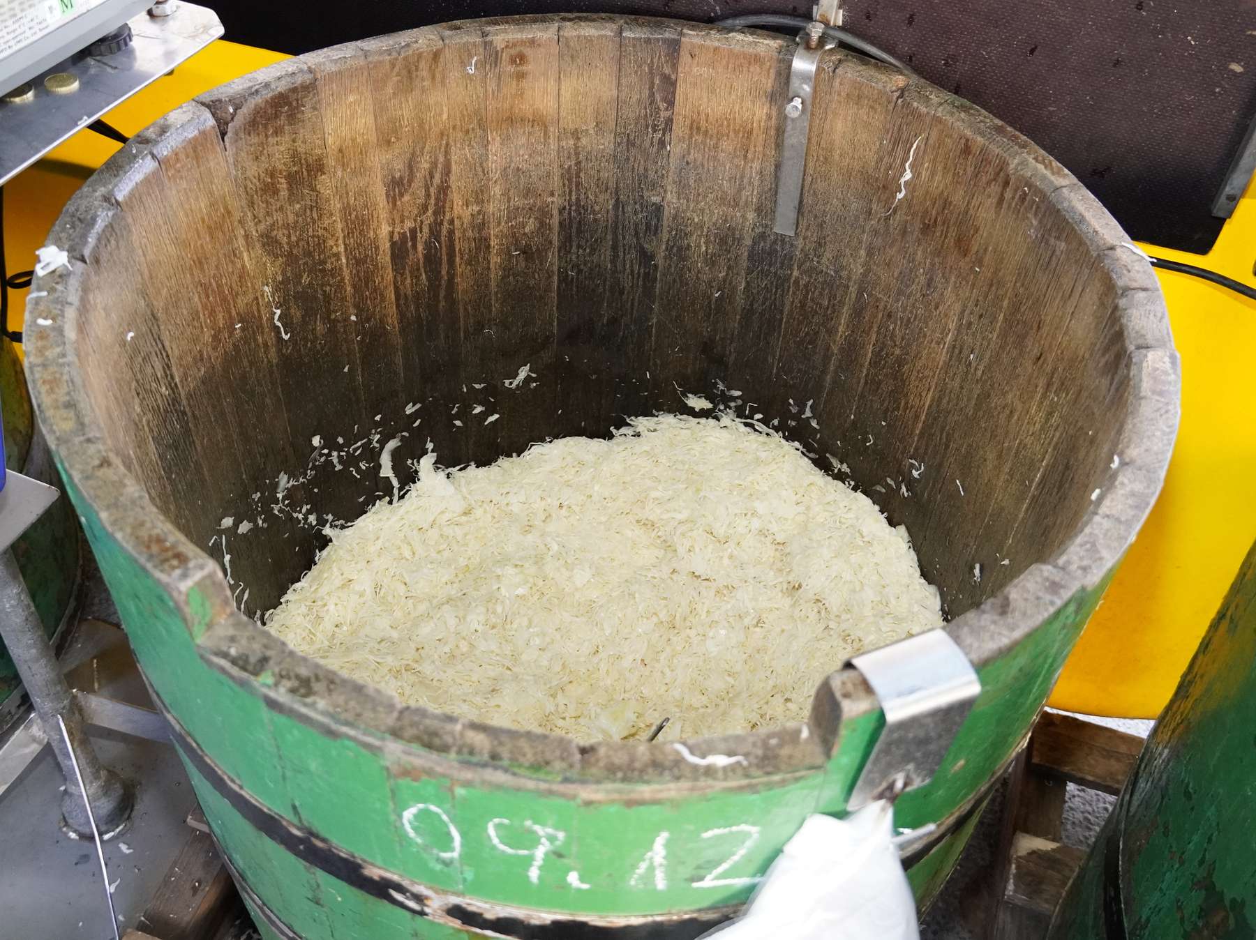 Die Großeltern von Peter Monger haben 1954 mit dem Gemüseanbau begonnen und bald darauf das erste Sauerkraut produziert. Seit 1960 werden die Produkte auch auf der Schranne verkauft. Jährlich erzeugt Monger-Konserven rund 240 Tonnen Krautspezialitäten. Das milde Kraut für die Schranne ist rund drei Wochen alt und wird ständig nachgeschnitten. Das Herbstkraut sei etwas schärfer, erklärt Peter. Zudem gibt es das Sarmakraut, eine Spezialität aus Südosteuropa, das gerne für Krautrouladen verwenden wird. Das unpasteurisierte Sauerkraut aus dem Holzbottich enthält wichtige Vitamine und Mikroorganismen. Drei Fässer mit 200 Kilo Sauerkraut sind auf der Schranne in Verwendung.