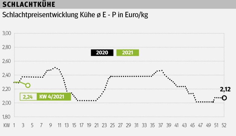 - Schlachtkühe: Preise sind unter Druck. Vor allem schwere Kühe sind aufgrund der fehlenden Exportmärkte stark unter Druck.