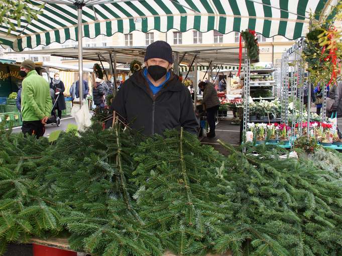 Jetzt ist zwar die Maske auf die Schranne zurückgekehrt, aber das kann die Stimmung der Besucher und Standler nicht trüben. Am Platz vor der Andräkirche ist der Advent eingezogen, an zahlreichen Ständen gibt es schön gebundene Adventkränze in allen Farben und Formen zu kaufen. „Meine Mutter sagt immer, je schlechter die Zeiten, desto eher wollen die Kunden einen traditionellen Kranz mit roten Kerzen, Zapfen und Nüssen“, erzählt Gärtner Alexander Kral, dem die klassische rote Variante auch am besten gefällt. Seine Frau Elisabeth meint dazu lachend, Männer würden generell die Farbe Rot bevorzugen.