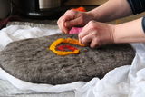Im Frühjahr 2021, nach der Geburt ihres vierten Kindes, begann sie die Schafwolle säuberlichst zu waschen und zu trocknen. „Das kann man sich ungefähr wie Weintreten vorstellen“, lacht sie. Verena brachte die Wolle nach Bruckdorf zum Kardieren. Die fertige Filzwolle abgeholt, versuchte sie sich mit einer YouTube-Video-Anleitung an Kinderpatschen. „Ich dachte mir: ,Das kann doch nicht so schwer sein‘ doch da hab ich mich definitiv geirrt.“ Schlussendlich bat sie die damalige Wollabnehmerin um Hilfe. Mit lehrreichem Wissen zuhause angekommen, konnte sie nun ihre ersten Patschen filzen. Doch es blieb nicht bei Patschen. Ihr Sortiment besteht mittlerweile aus Sitzkissen, Taschen sowie Vasenüberziehern. Da sie sich immer schon für Kunstgeschichte interessierte und auch in Kinderjahren einem Bildhauer über die Schulter schaute, verwirklicht sie ihre Künste nun auf ihren Filzprodukten. „Mutiger werden und wenn einem etwas ,taugt‘ es einfach probieren“ – mit diesen Worten startet Verena in den Tag.