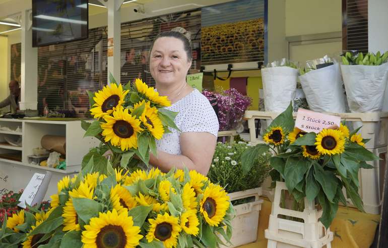 Strahlend gelb leuchtete es Ende August an zahlreichen Ständen auf der Schranne. Große, schöne Sonnenblumen gab es zum Preis von 2,50 bis 3 Euro pro Stück. Die Blütenköpfe sind nicht nur eine Augenweide, wie Ulli Veit von „Blumen Veit“ in Salzburg-Liefering betont. „Die Bienen stehen voll drauf“, wie sie sagt. Wer die schönen Pflanzen in einer Vase lange frisch halten wolle, solle sie daheim schneiden und die Stiele kurz in heißes Wasser tauchen, empfiehlt die Expertin. Die Sonnenblumen seien als Dekoration bei großen Bauernhochzeiten sehr gefragt.