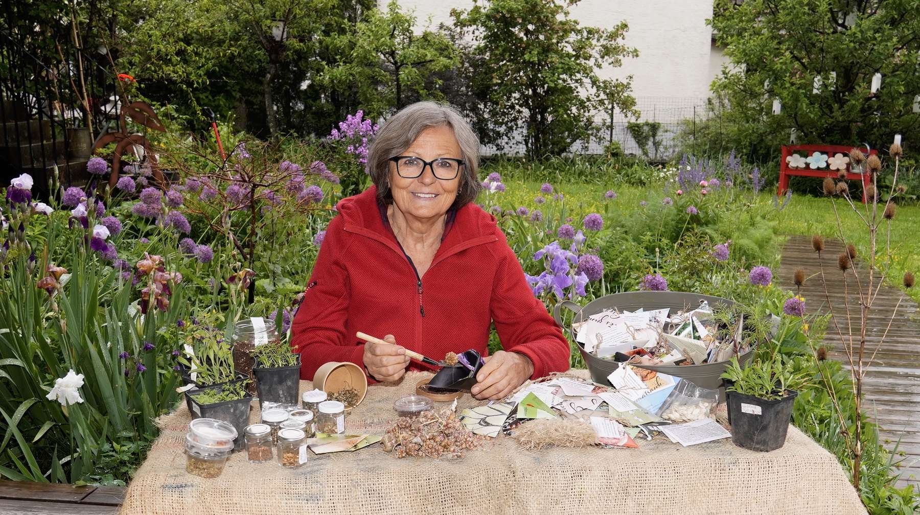 Auf der Terrasse in ihrem Garten hat Karoline Greimel jene Schätze ausgebreitet, die sie hier geerntet hat. In Gläsern, Säckchen und Dosen bewahrt sie unzählige verschiedene Samen auf. Umsichtig verpackt sie die Sorten einzeln in speziell gefaltete Tüten. Auch viele kleine, von ihr gezogene Pflanzen, warten darauf pikiert und umgetopft zu werden. Der Imkerin ist es ein großes Anliegen, wertvolle Nahrung für Bienen zu verbreiten.