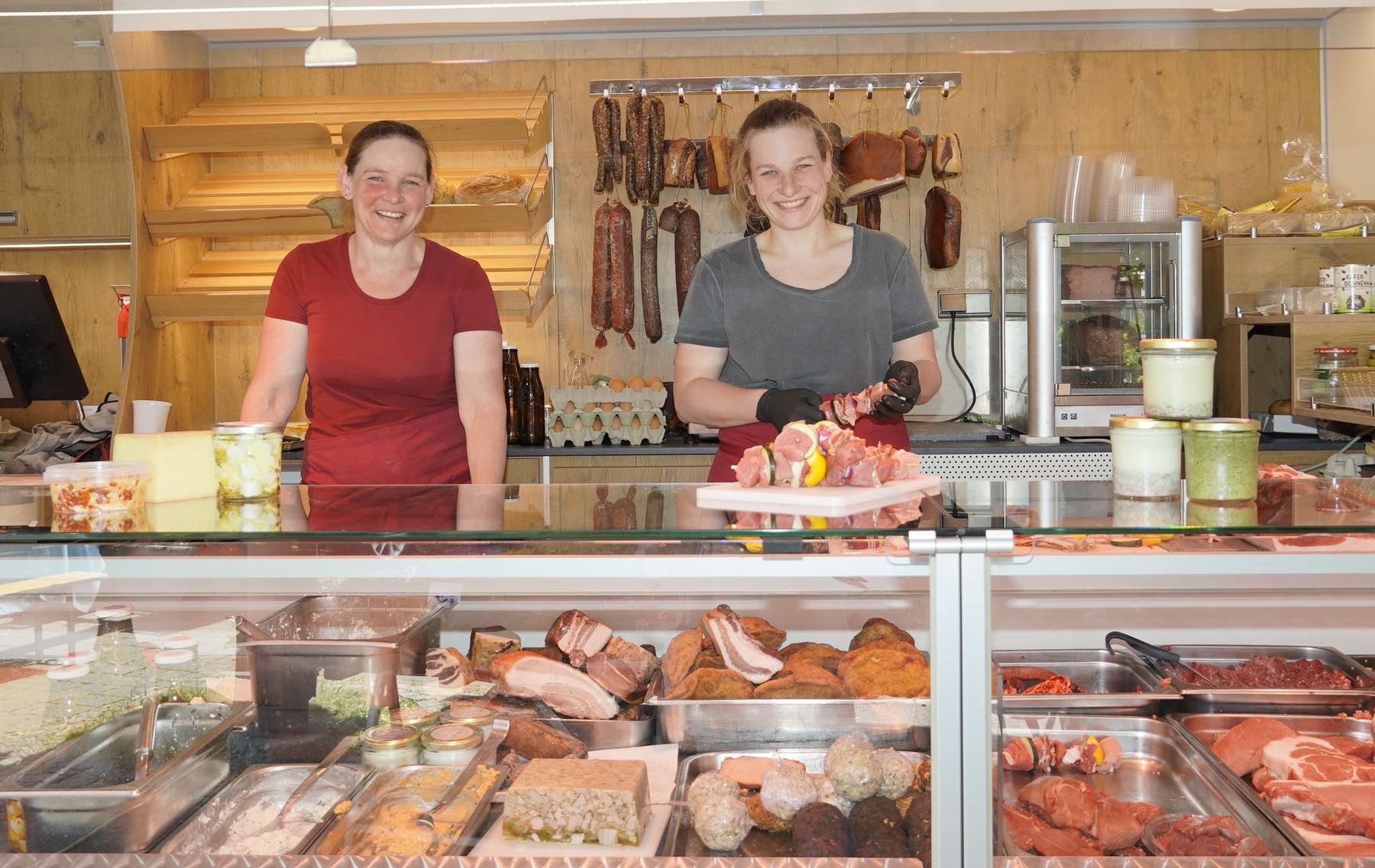Katharina Brunauer und ihre Tochter Lena vom Spitalergut in Adnet fahren schon seit 16 Jahren zum Bauernmarkt nach Strobl. Die tüchtigen Bäuerinnen sind mit ihren Produkten auch auf der Schranne Salzburg und am Grünmarkt Hallein zu finden. Haus- und Mangalitzaschweine sind das Hauptstandbein des Betriebes. Die Tiere haben Auslauf und Strohboden, das schmeckt man bei Ripperl, Schnitzel etc. Geflügel, Rinder und auch Wild vervollständigen das Angebot, denn wenn Zeit bleibt, gehen die Jägerinnen auch selber auf die Jagd. In der eigenen Käserei werden Frischmilchprodukte wie Topfen, Butter und Sauerrahm produziert. Auch Knödel, Fleischkrapfen, Sulze und Aufstriche sind bei den Kunden beliebt. Die Tennengauerinnen brennen auch Schnaps aus dem Obst am Hof. Besonders schmackhaft ist ihr Brot, das mit Mehl aus der Lerchenmühle und mit Buttermilch gemacht wird