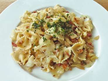 Zwiebel und Schinken in Butterschmalz anrösten, Fleckerl dazugeben, durchrösten und pikant würzen. Mit grüner Petersilie verfeinern.