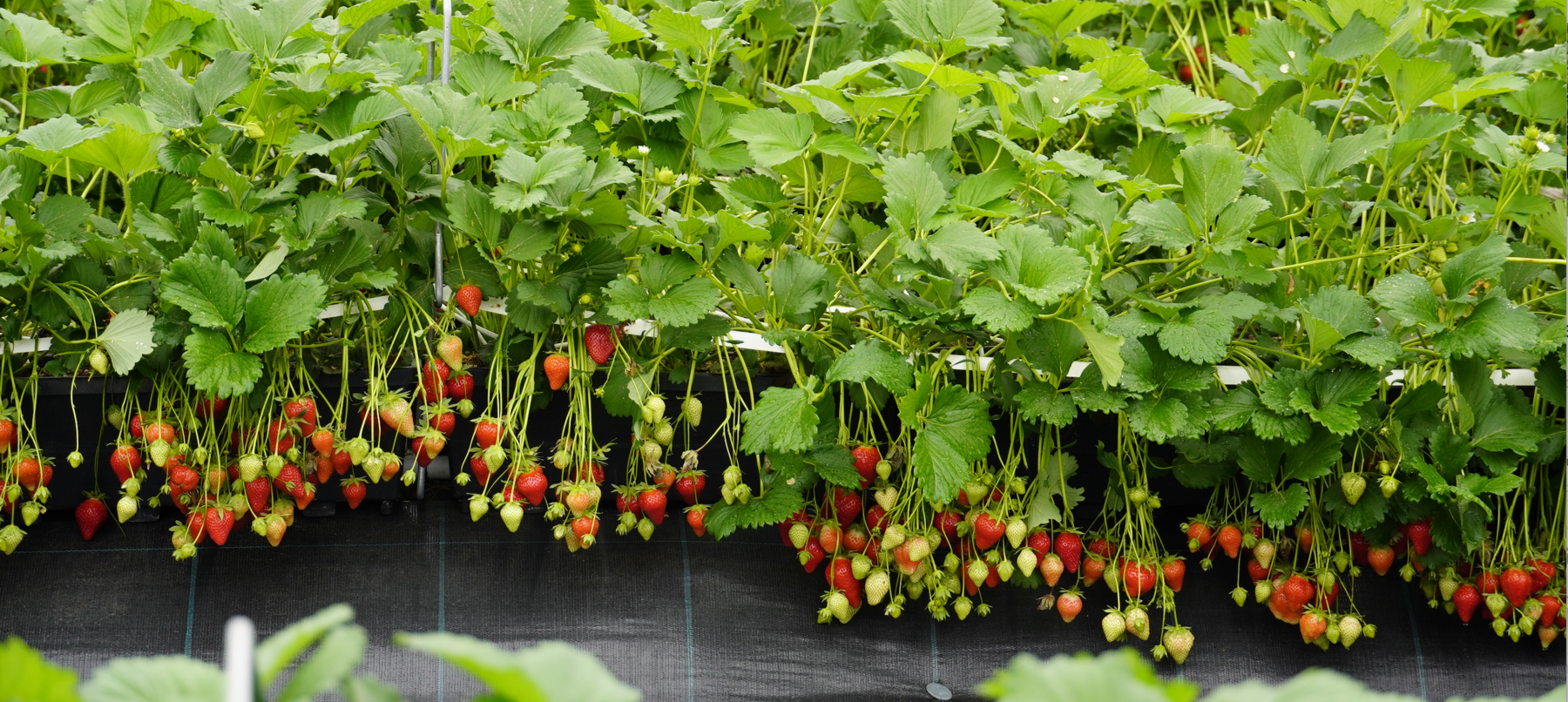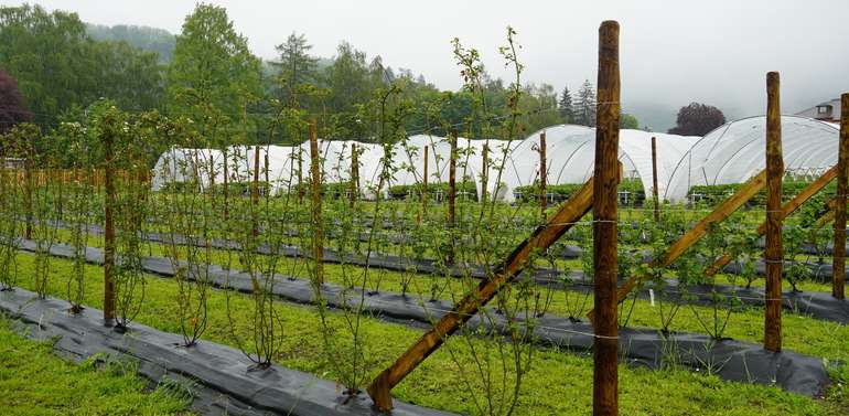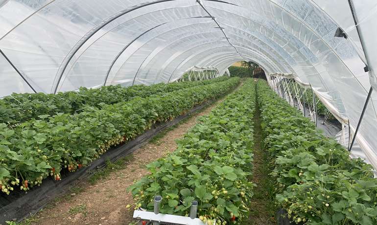 Die prächtigen roten Früchte befinden sich auf Kniehöhe und sind sehr praktisch zu pflücken. Ab Ende Mai wird es noch eine Spur bequemer, dann heißt es „pflücken ohne bücken“, denn in diesen Anlagen hängen die Beeren fast auf Augenhöhe.