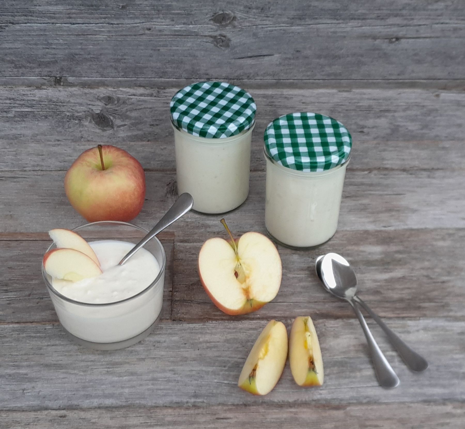 Die Äpfel grob raspeln und alle Zutaten zu einer Creme verrühren. Nach Geschmack noch mit Vanillezucker süßen oder mit Zimt abschmecken. Sehr gut passen auch Rosinen oder Haferflocken in die Creme.