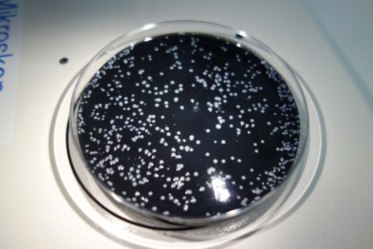 Während der Bebrütung entwickelt sich aus jedem Keim eine Kolonie. 1 weißer Punkt steht für 1 koloniebildende Einheit. Aus dem unsichtbaren Keim wurde eine mit freiem Auge sichtbare Kolonie. © Zaussinger/LK Oberösterreich
