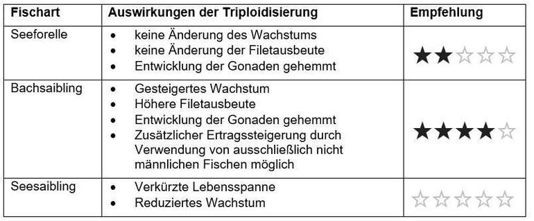 Bei allen untersuchten Arten brachte die Triploidisierung aber auch Nachteile, da der Prozentsatz der missgebildeten Fische höher und das Immunsystem schwächer ist als bei diploiden Fischen. Diese beiden Faktoren haben aber keinen direkten Einfluss auf die Produktion, insbesondere nicht auf die Produktqualität und auf die Ausfallsraten.