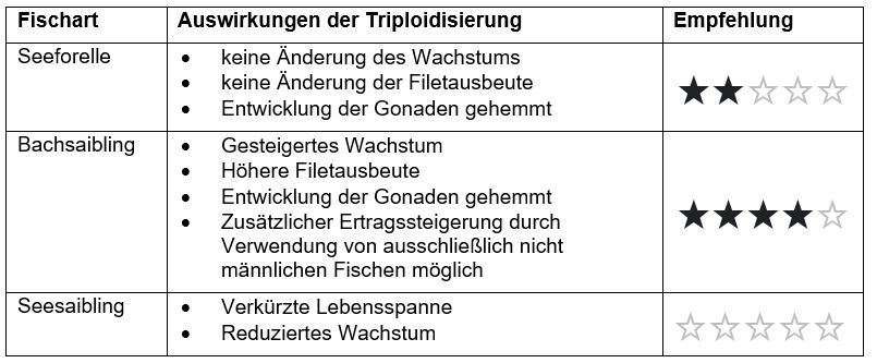 Wie bereits erwähnt, sind triploide Fische grundsätzlich nur für Speisefischproduzenten interessant. In der gemischten Produktion von Besatz- und Speisefischen sind sterile Fische nicht gewünscht. Wie viele andere Fischarten, werden Forellen und Saiblinge schon seit Jahrzehnten züchterisch optimiert, um eine bessere Futterverwertung, geringe Anfälligkeit oder eine bessere Filetqualität zu erhalten. Das Einbringen solcher Zuchtstämme in Freigewässer ist, auch ohne Triploidisierung, ökologisch und fischereilichen wenig sinnvoll. Bei Trennung von Besatzfisch- und Speisefischproduktion, spricht jedoch nichts gegen eine parallele Erzeugung von konventionellen und triploiden Fischen im selben Betrieb.