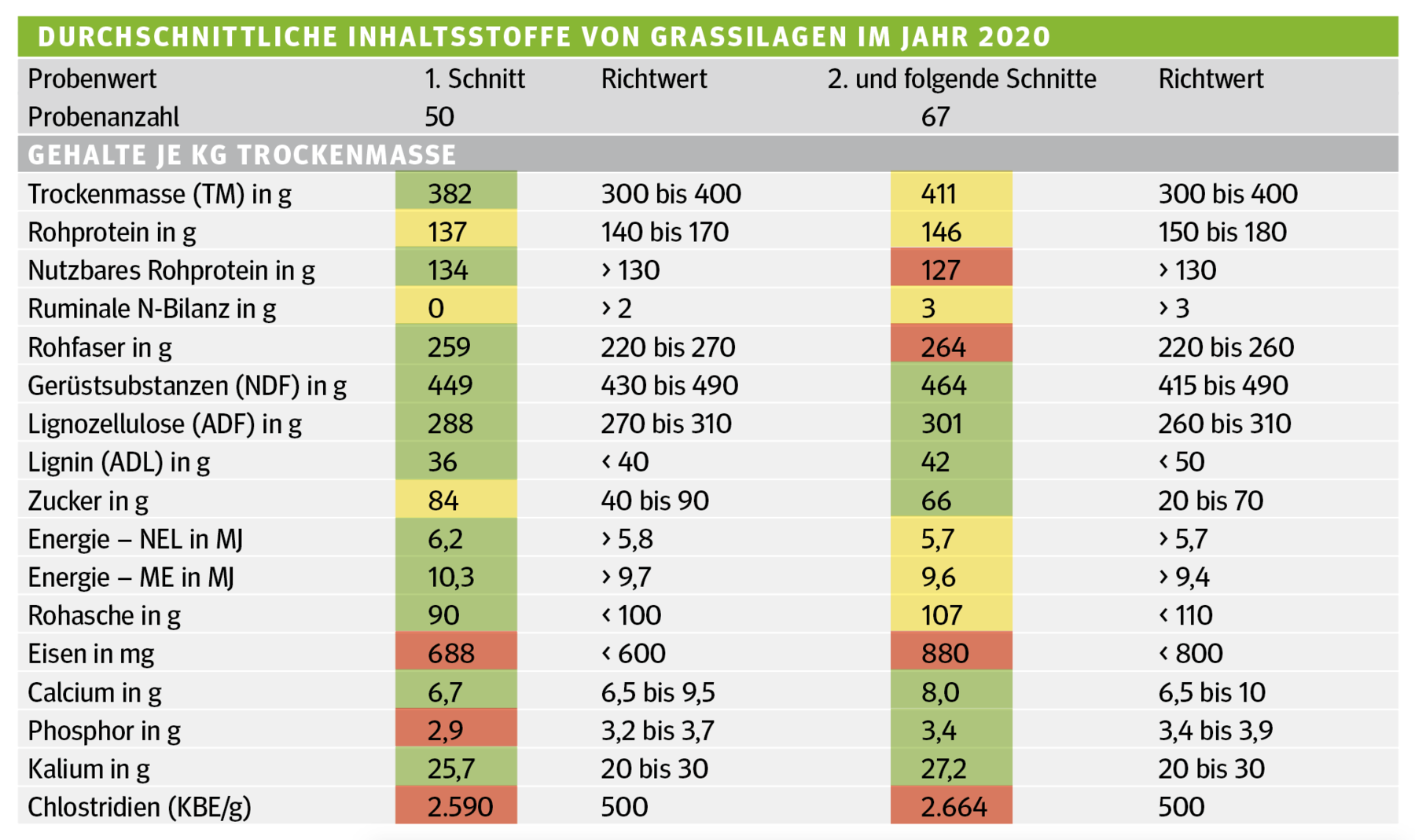 Auch die Restzuckergehalte sind um ca. 1,5 Prozentpunkte höher als im Vorjahr. In Verbindung mit eventuell höheren Kraftfuttergaben pro Tier und Tag sollten verstärkt pansenbeständige Kraftfutterkomponenten (Mais, Trockenschnitzel …) eingesetzt werden, um keine Pansenübersäuerung und Klauenprobleme zu riskieren. Bei höheren Umgebungstemperaturen ist in Kombination mit hohen Trockenmassegehalten mit einer höheren Gefahr der Silonacherwärmung zu rechnen als in den letzten Jahren.