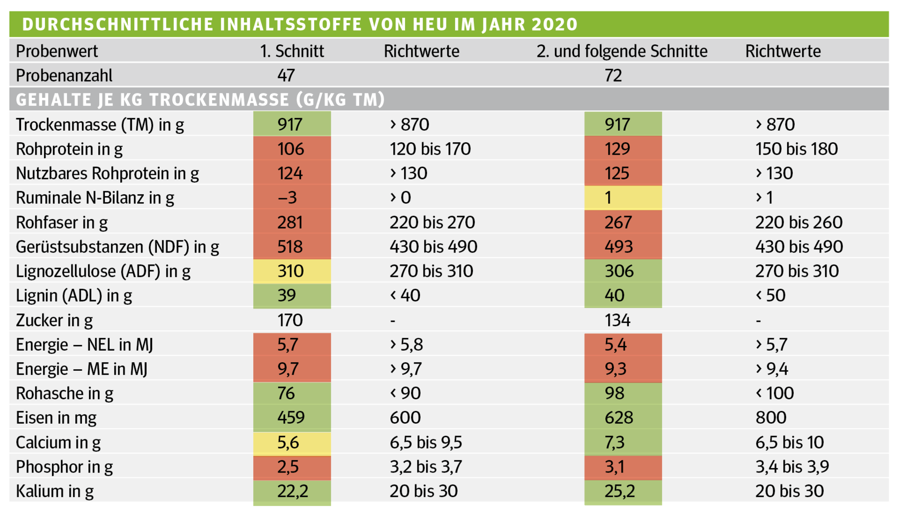 Bei der Qualität des Heues aus 2020 fallen vor allem die niedrigen Rohproteingehalte und die daraus folgende geringe ruminale Stickstoffbilanz (RNB) auf. Dieser Umstand war bereits bei der Grünfütterung im Sommer zu beobachten. So liegt der Gehalt beim ersten Aufwuchs zwar nur um 0,6 Prozentpunkte hinter dem Vorjahr, aber jener der Folgeaufwüchse um 1,8 Prozentpunkte.