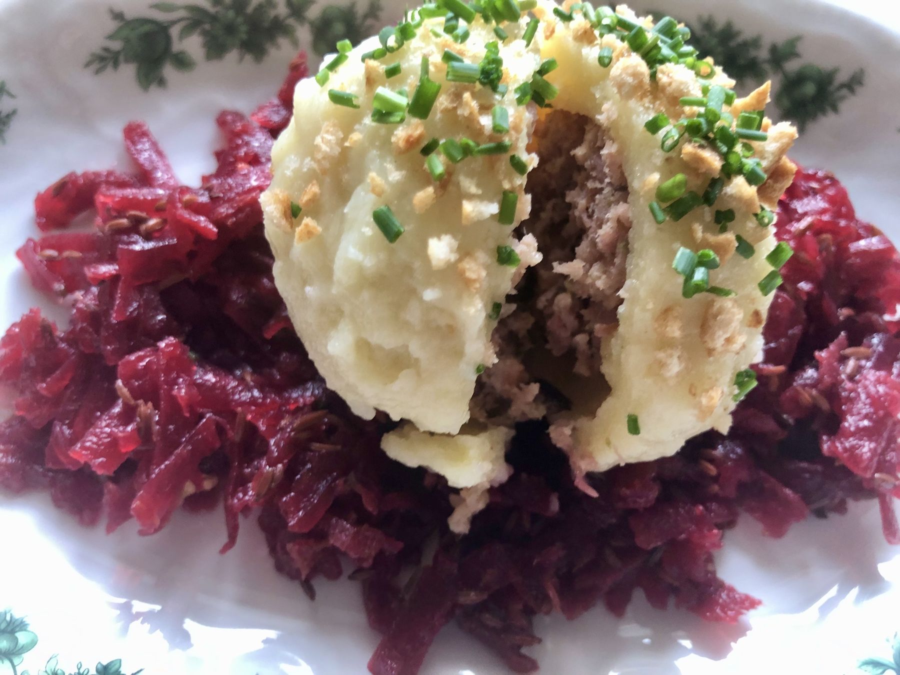 Aus gekochten Erdäpfeln, Salz, Muskat, Butter, Mehl und Erdäpfelstärke einen Teig bereiten und 30 Minuten rasten lassen. Vom Erdäpfelteig Stücke à 50 g abstechen, etwas flachdrücken und die gefrorenen Kugeln damit dicht umhüllen. Die Knödel für ca. 15 Minuten in kochendem Salzwasser ziehen lassen. Mit Blaukraut oder Roten Rüben servieren.