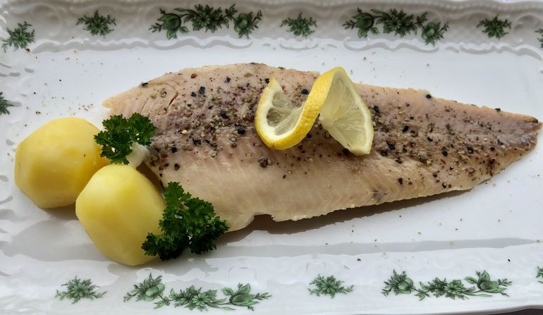 Das Räucherfischfilet auf einen Teller legen, mit Petersilie, Zitrone und Oberskren dekorieren und mit gekochten Erdäpfeln servieren.