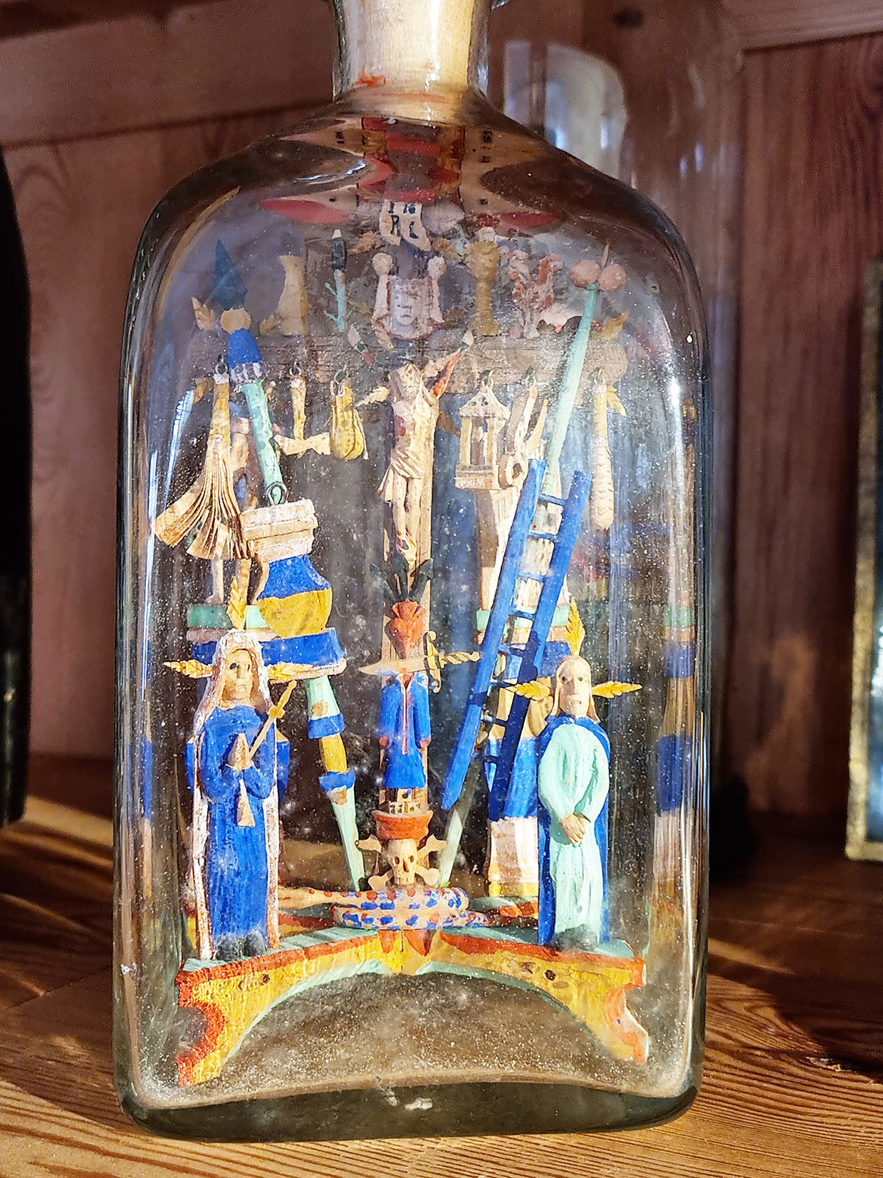 Von Bedeutung ist besonders ein Objekt eines „Eingerichteten“. Es stellt in herber Struktur, aber farbenfroh gestaltet, die Szene der Kreuzigung Christi dar. „Eingerichtete“ sind Glasflaschen, in denen Darstellungen figural durch den Flaschenhals „eingerichtet“ und mit einem Korken wieder verschlossen wurden. Weitere dieser Unikate stellen etwa Heilige oder einen Altar mit Pfarrer und Ministranten dar. Sie stammen aus dem 19. Jahrhundert.