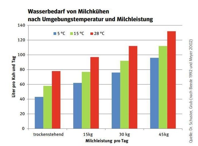 Aber auch der Bedarf der trockenstehenden Kühe oder Kalbinnen mit knapp 50 l ist nicht zu unterschätzen.