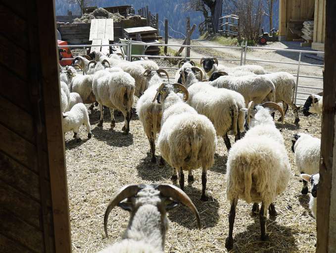 5 Kalbinnen, 30 Mutterschafe und Nachzucht, 5 Hühner, 4 Laufenten; Almhütte, Hofladen