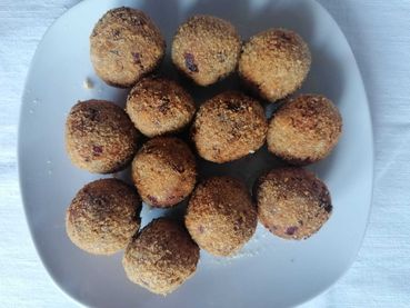 Rehschulter faschieren, gehacktes Gemüse zur Masse geben, Gewürze und Wildkräuter fein hacken, Zitrone abreiben, mit Salz und Pfeffer unter die Masse rühren. Panade vorbereiten: Ei und Brösel in Gefäße geben. Die Farce (Fleischmasse) zu kleinen Bällchen formen, mit der Panade panieren und wie ein Schnitzel bei 140 °C heißem Öl 3 bis 4 Minuten backen.