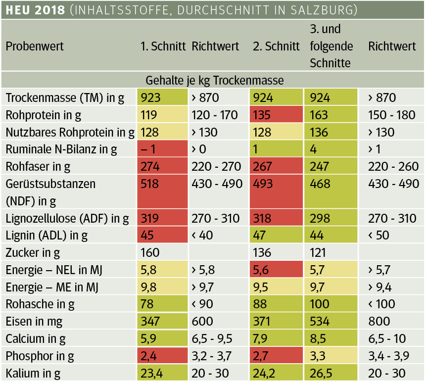 Ähnlich dem Jahr 2017 kam es auch 2018 beim Heu des ersten und zweiten Aufwuchses vielfach zu einem zu späten Schnitt. Dies zeigt sich an den hohen Rohfaser- und Gerüstsubstanzgehalten, die über den empfohlenen Richtwerten liegen. Folgen dieses späten Schnittzeitpunktes sind wie immer geringe Rohproteingehalte (= Eiweißgehalte) sowie mäßige Energiegehalte.
