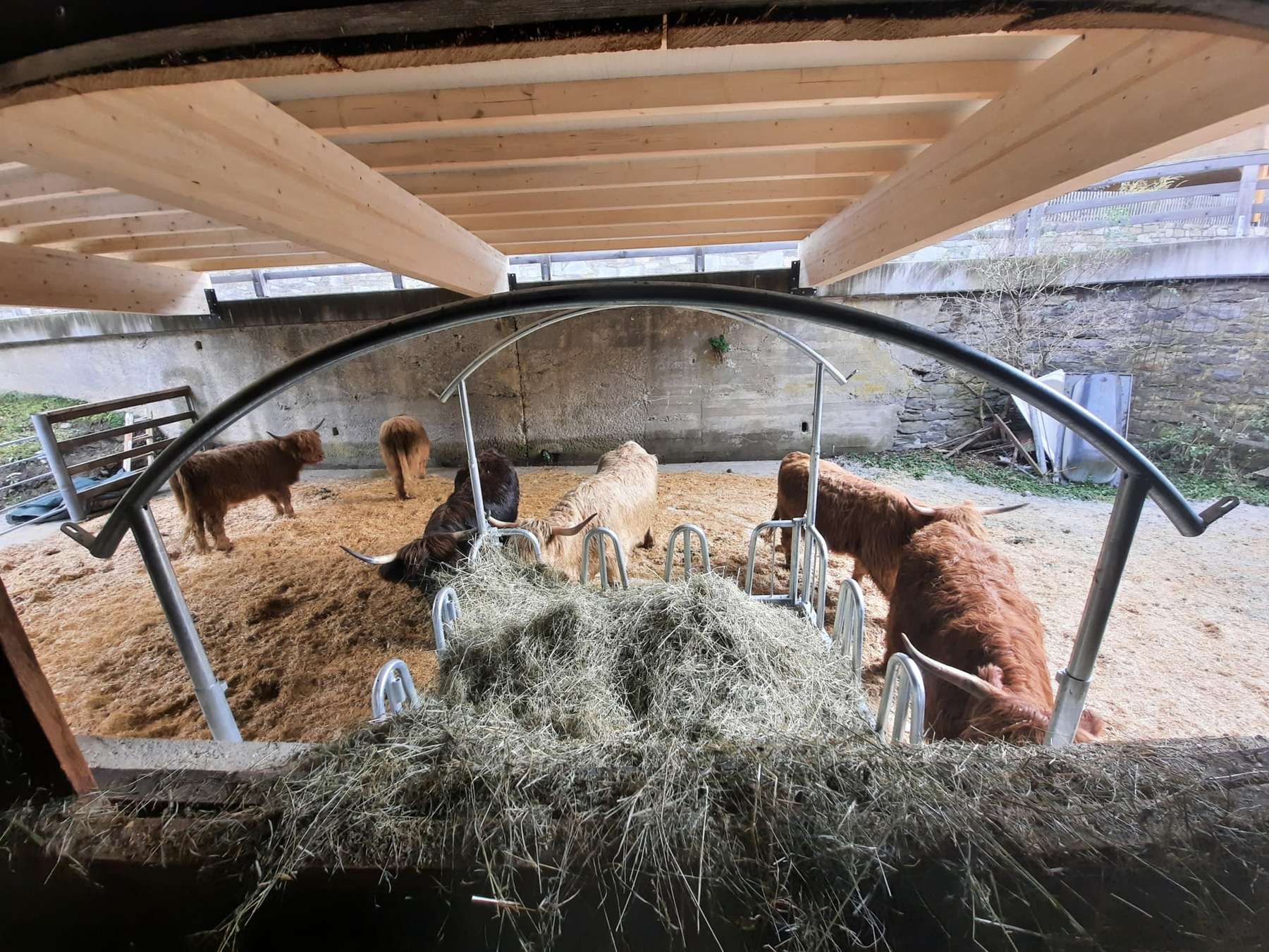 Ein Anliegen war es auch, nicht allzu viel in das bestehende alte Stallgebäude zu investieren und trotzdem einen guten Komfort für Mensch und Tier zu erreichen. Derzeit ist man mitten in den Umbauarbeiten zu einem Tiefstreustall. 2020 durften die ersten trächtigen Hochlandrinder im 1.500 m2 großen Freilaufgehege mit Unterstand einziehen. „Die Haltung von Hochlandrindern steht völlig im Einklang mit der Natur. Sie fressen lediglich bestes Heu und Trockensilage, sind gutmütig, langlebig, geländetauglich, winterhart, fürsorglich untereinander und kalben von selbst ab. Den Tierarzt brauchten wir bis jetzt nur einmal, ansonsten greifen wir auf homöopathische Mittel zurück“, berichtet Heinz.